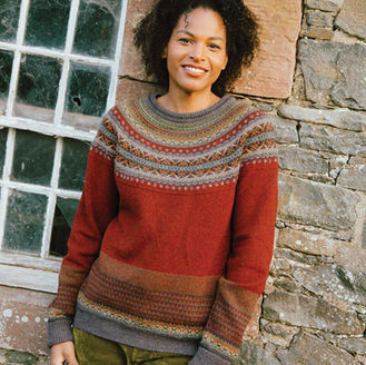 The Alpine is a stylish, colourful, cosy knit, rich in Scottish history offering a modern vibrant approach in its colours. An eye-catching addition to your store’s interior layout. Customers love the comfort and luxury of the fine micron, woollen spun Merino yarn, the meticulous attention to detail, unique number of colours and construction of the beautiful Fairisle yoke. The design inspiration for this collection comes from late 18th century handknit found in the very North of Scotland. The design is technically complex requiring high levels of hand skills.